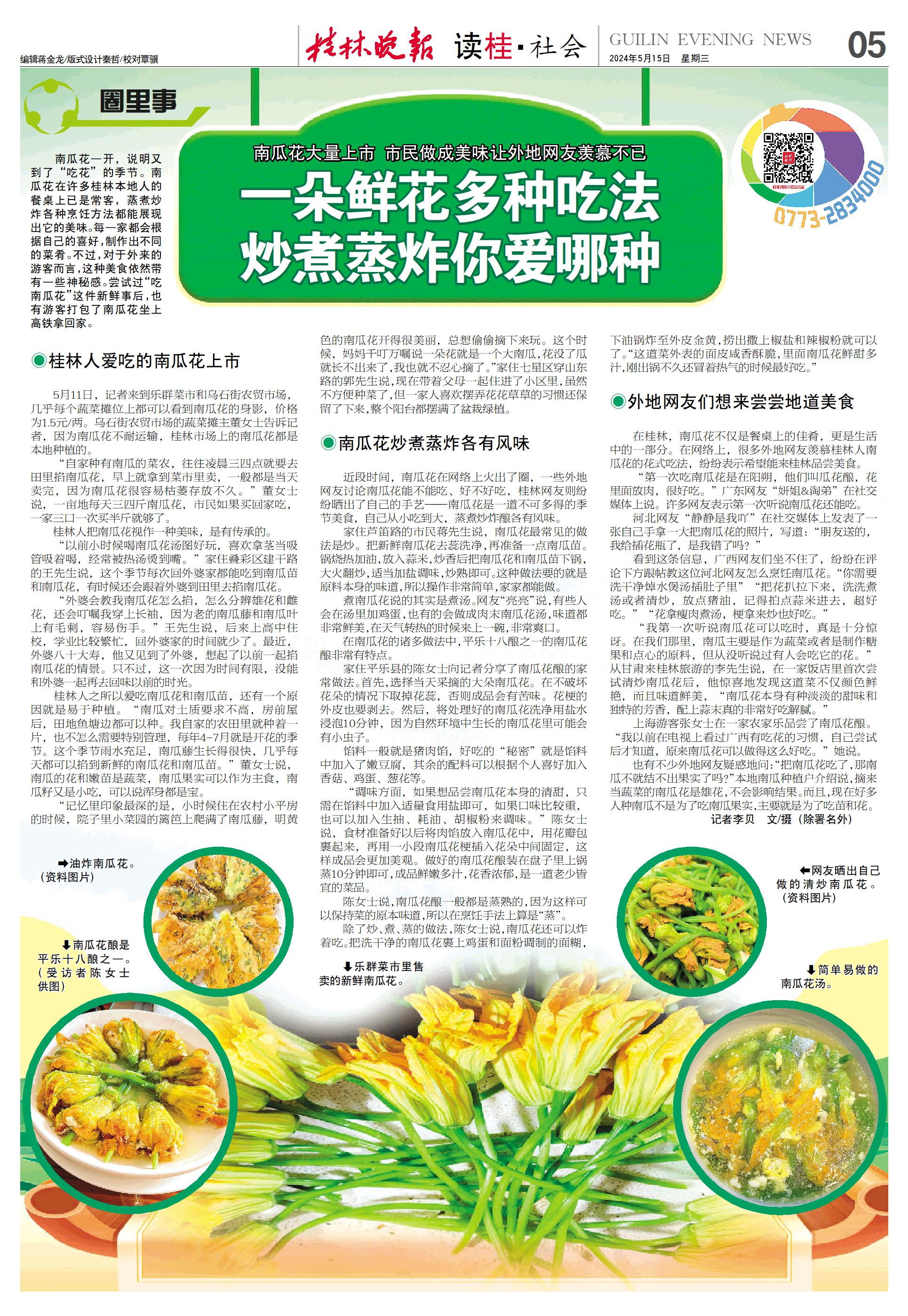 “以前小时候喝南瓜花汤图好玩,喜欢拿茎当吸管吸着喝,经常被热汤烫到嘴。”家住叠彩区建干路的王先生说,这个季节每次回外婆家都能吃到南瓜苗和南瓜花,有时候还会跟着外婆到田里去掐南瓜花。