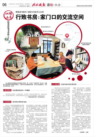 在七星区的桂林橡胶设计院宿舍小区里,有一个名叫“行致书房”的小店。这里是广西桂林图书馆馆外流通点,大家可以在这里借阅书籍,也可以在这里看书,与书友们相互交流、分享。