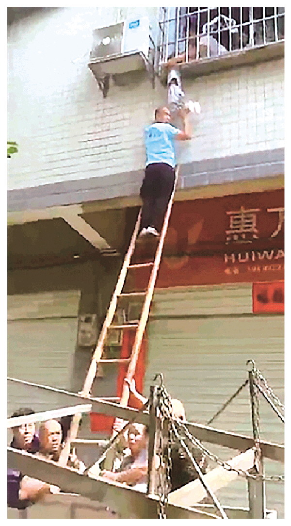 众邻居扶着木梯,助郭胜托举救小女孩。