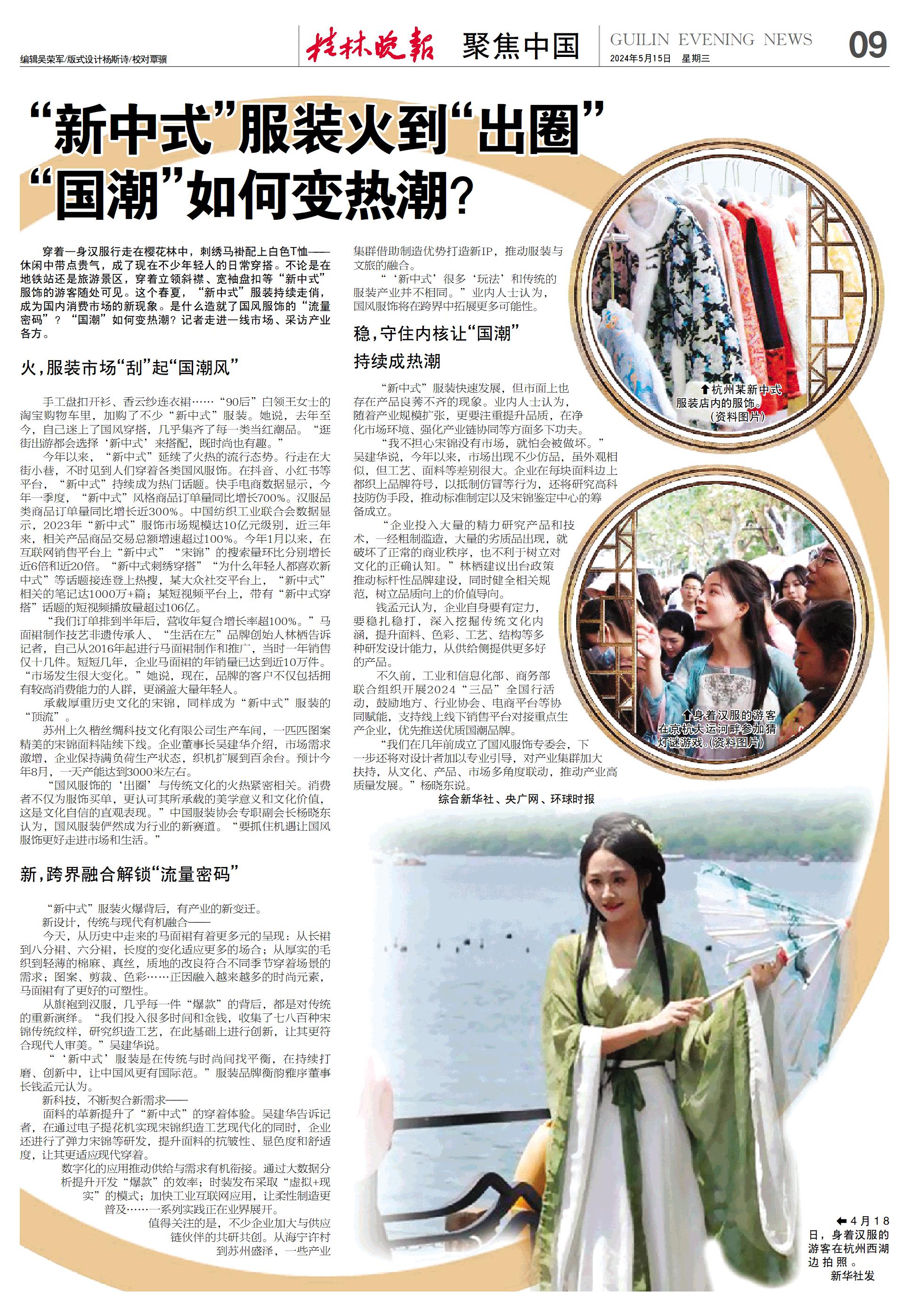 “新中式”服装快速发展,但市面上也存在产品良莠不齐的现象。业内人士认为,随着产业规模扩张,更要注重提升品质,在净化市场环境、强化产业链协同等方面多下功夫。