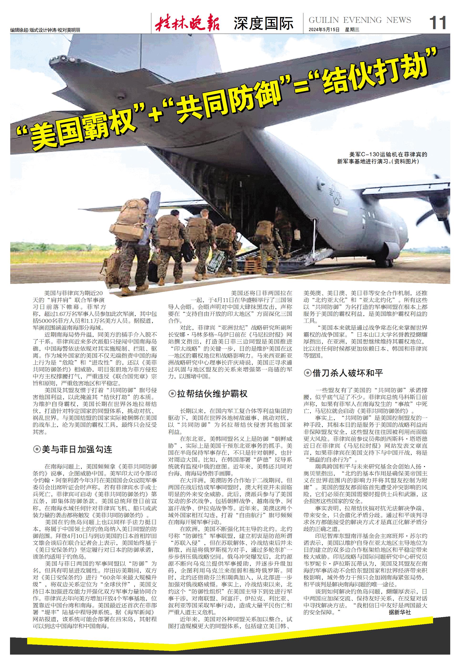 事实上,“共同防御”是美国控制盟友的一种手段,其根本目的是服务于美国的战略利益而非保障盟友安全,这些盟友往往因被利用而面临更大风险。菲律宾前参议员弗朗西斯科·塔塔德近日在菲律宾《马尼拉时报》网站发表文章直言,如果菲律宾在美国支持下与中国开战,将是“愚蠢的自杀行为”。