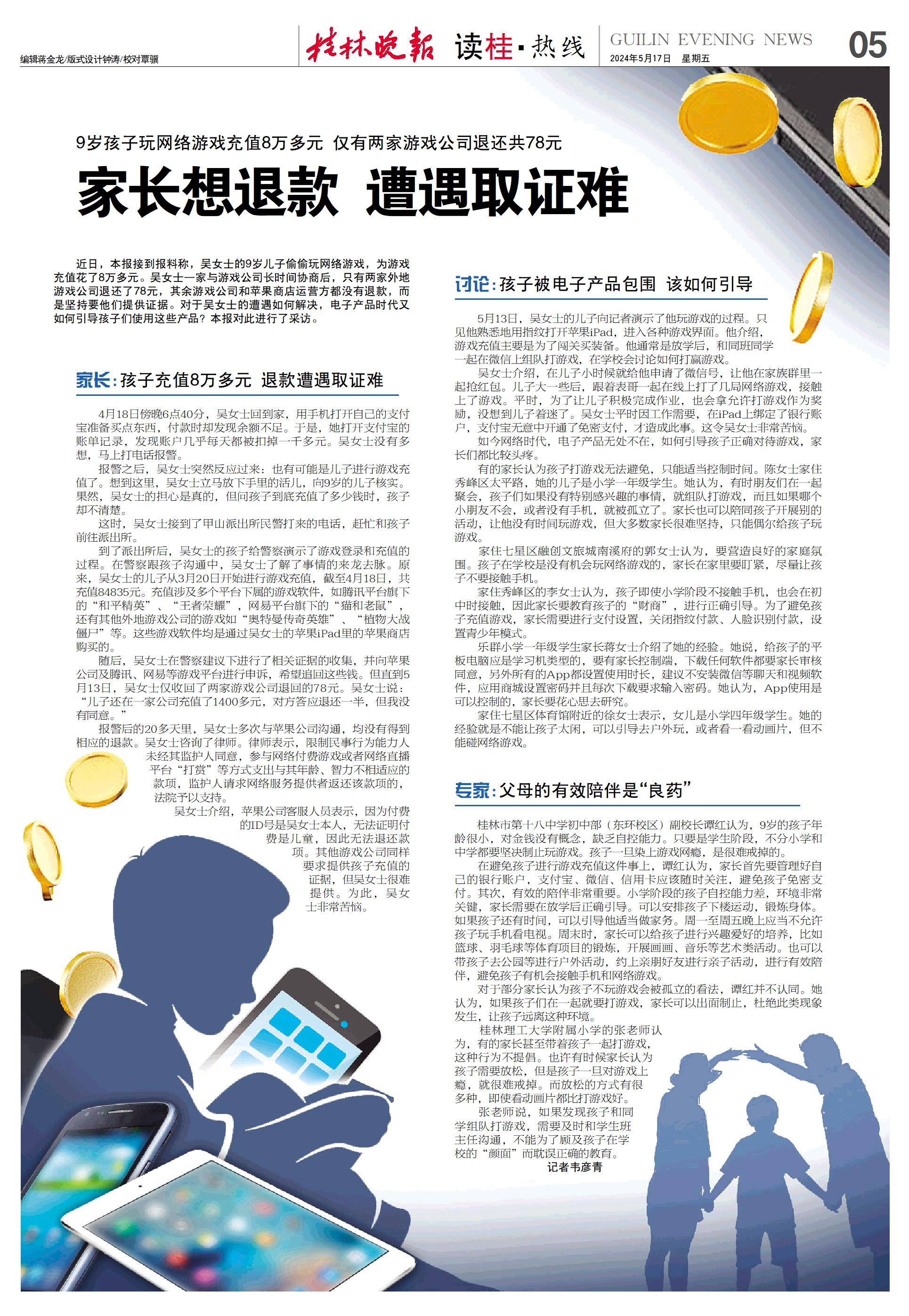 近日,本报接到报料称,吴女士的9岁儿子偷偷玩网络游戏,为游戏充值花了8万多元。吴女士一家与游戏公司长时间协商后,只有两家外地游戏公司退还了78元,其余游戏公司和苹果商店运营方都没有退款,而是坚持要他们提供证据。对于吴女士的遭遇如何解决,电子产品时代又如何引导孩子们使用这些产品?本报对此进行了采访。