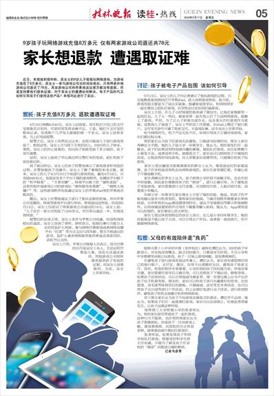桂林市第十八中学初中部(东环校区)副校长谭红认为,9岁的孩子年龄很小,对金钱没有概念,缺乏自控能力。只要是学生阶段,不分小学和中学都要坚决制止玩游戏。孩子一旦染上游戏网瘾,是很难戒掉的。