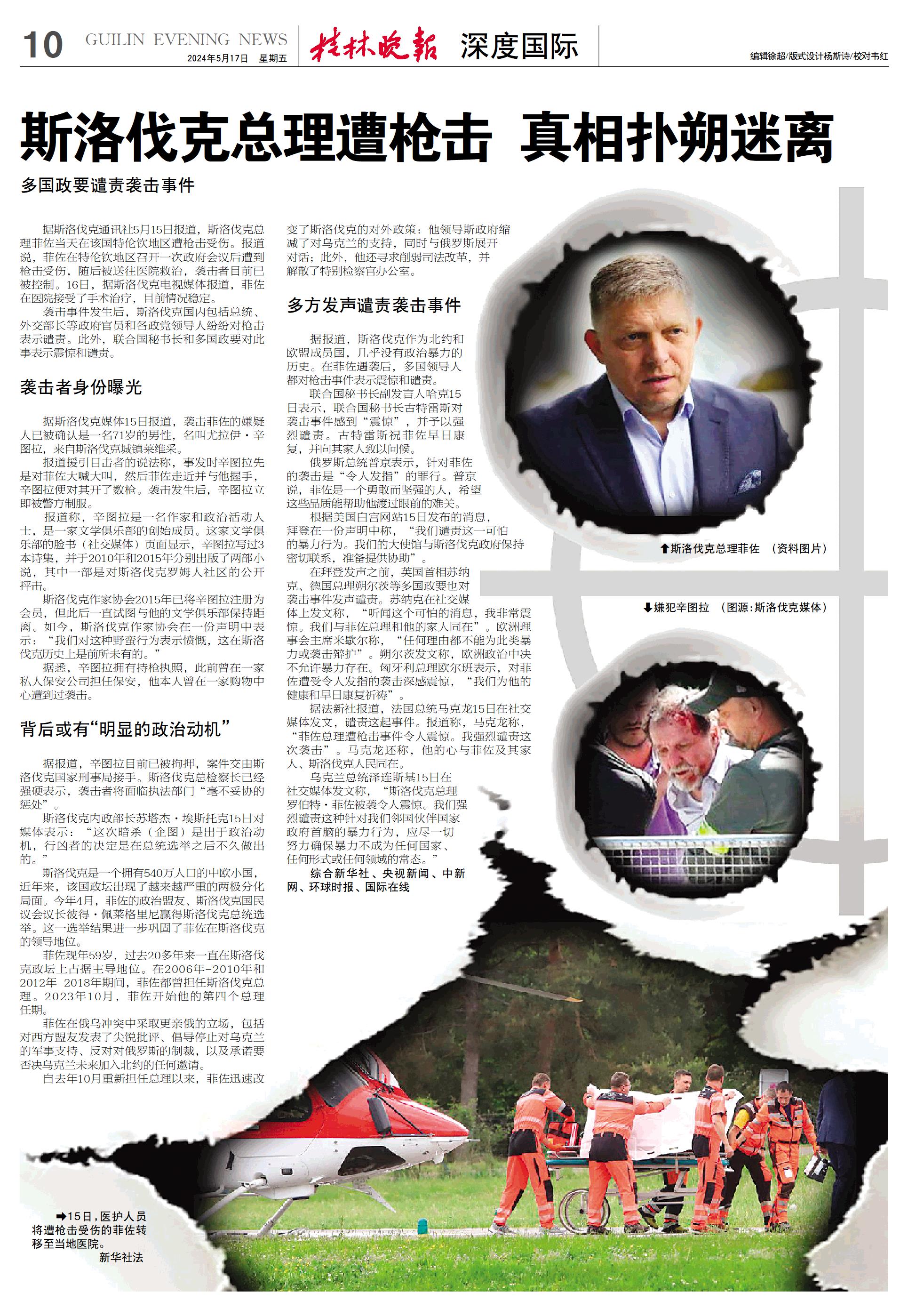 乌克兰总统泽连斯基15日在社交媒体发文称,“斯洛伐克总理罗伯特·菲佐被袭令人震惊。我们强烈谴责这种针对我们邻国伙伴国家政府首脑的暴力行为,应尽一切努力确保暴力不成为任何国家、任何形式或任何领域的常态。”