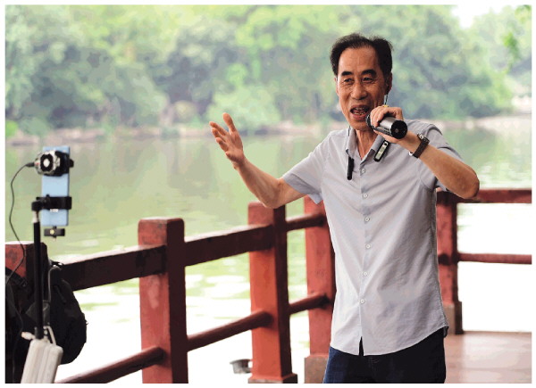 5月16日,市民李先生在两江四湖榕湖边直播唱歌。他表示,退休后有了更多时间做自己喜欢的事,在桂林的青山绿水间唱歌感觉非常好。记者邢刚 摄