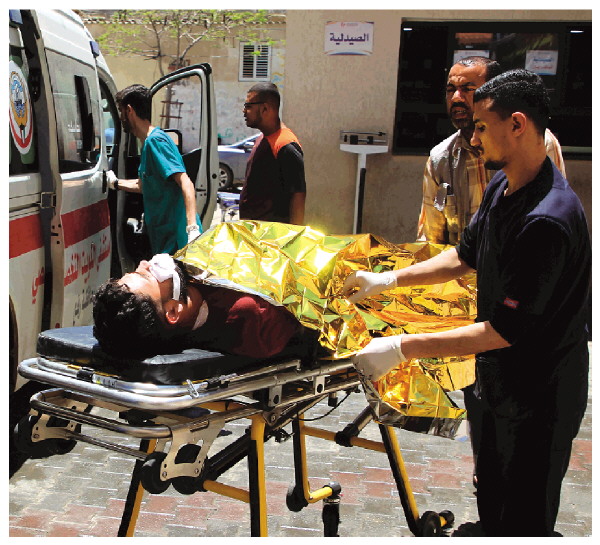 ↑5月15日,在加沙地带南部城市拉法,伤者被