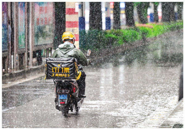 19日桂林降下暴雨,当天中午,一名外卖小哥为了准时将外卖送到顾客手中,在上海路上冒雨前行。 记者滕嘉 摄