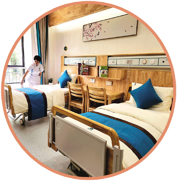 ↑与普通病房不同,桂林夕阳红养老中心安宁疗护病房除了病床还配有桌椅、沙发、书籍等,环境更加温馨。