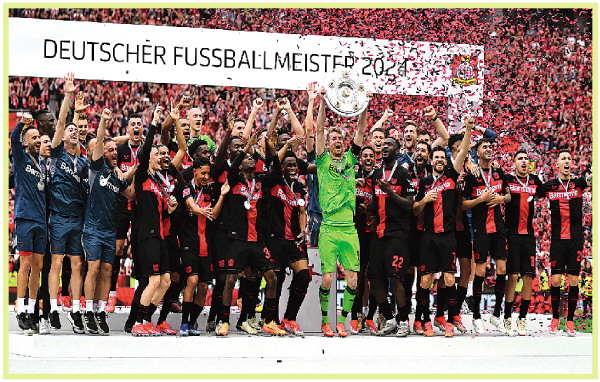 早在4月15日,在德甲第29轮比赛中,勒沃库森主场以5比0大胜不莱梅,提前五轮夺得建队120年来的第一个德甲冠军。提前夺冠之后,勒沃库森并没有松懈,完成了首支德甲球队不败夺冠的伟业,最后一轮在主场以2比1战胜奥格斯堡,本赛季联赛战绩定格为28胜6平。赛后,门将队长赫拉德斯基高高举起德甲冠军奖盘。