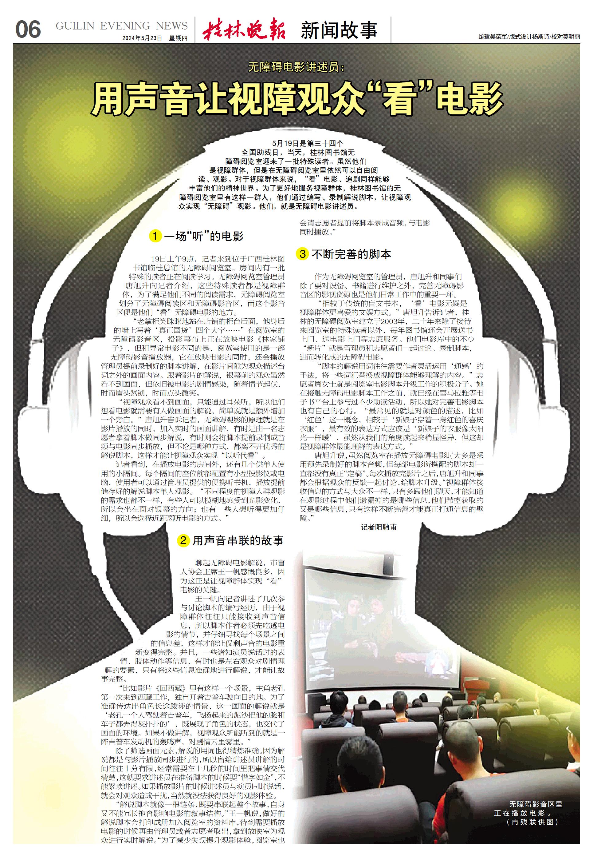 5月19日是第三十四个全国助残日,当天,桂林图书馆无障碍阅览室迎来了一批特殊读者。虽然他们是视障群体,但是在无障碍阅览室里依然可以自由阅读、观影。对于视障群体来说,“看”电影、追剧同样能够丰富他们的精神世界。为了更好地服务视障群体,桂林图书馆的无障碍阅览室里有这样一群人,他们通过编写、录制解说脚本,让视障观众实现“无障碍”观影。他们,就是无障碍电影讲述员。
