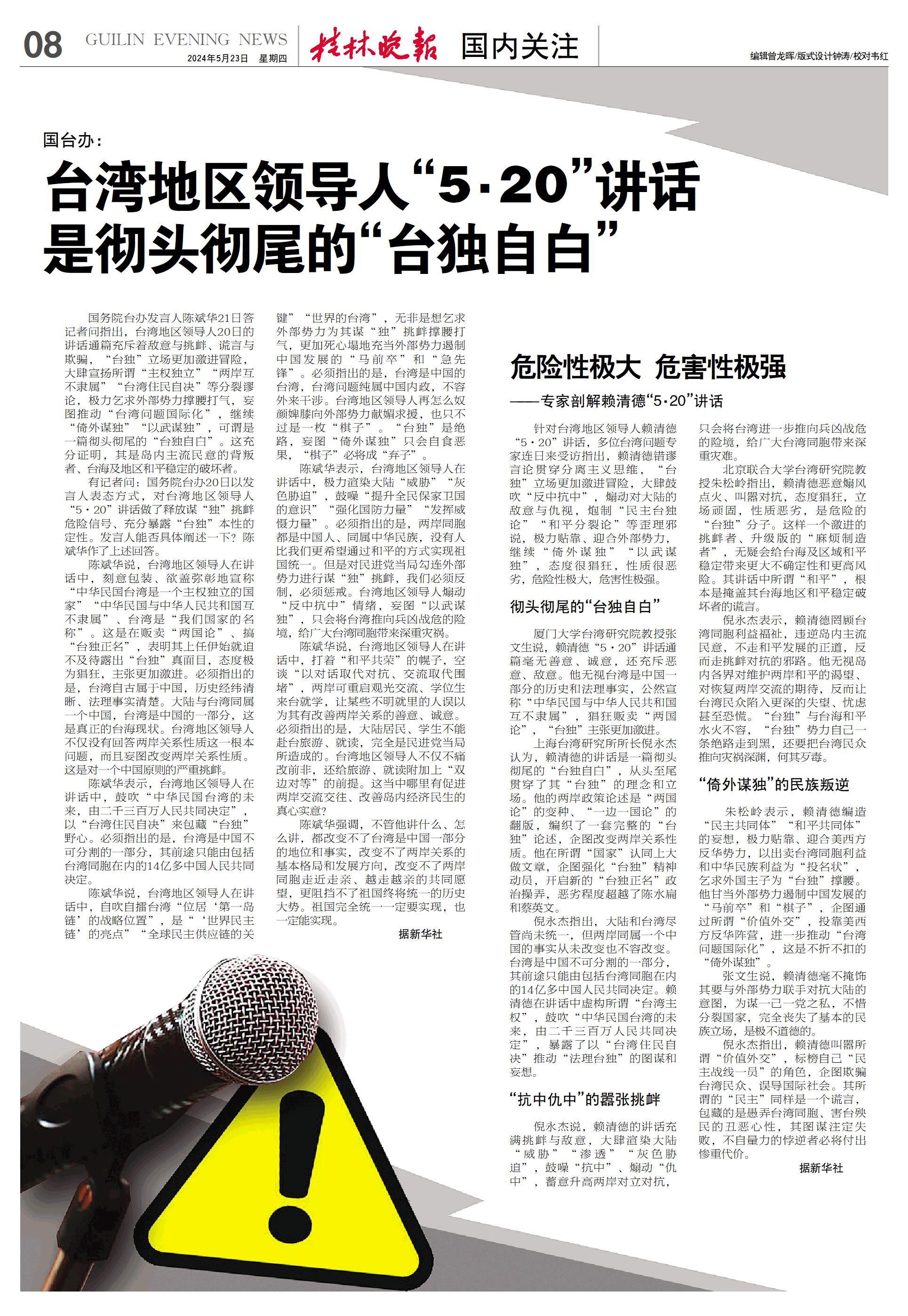 针对台湾地区领导人赖清德“5·20”讲话,多位台湾问题专家连日来受访指出,赖清德错谬言论贯穿分离主义思维,“台独”立场更加激进冒险,大肆鼓吹“反中抗中”,煽动对大陆的敌意与仇视,炮制“民主台独论”“和平分裂论”等歪理邪说,极力贴靠、迎合外部势力,继续“倚外谋独”“以武谋独”,态度很猖狂,性质很恶劣,危险性极大,危害性极强。