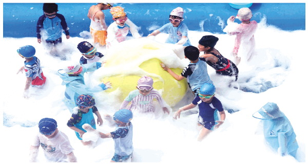 5月30日,在杭州市萧山区香悦幼儿园,小朋友在“泡泡派对”上玩耍。