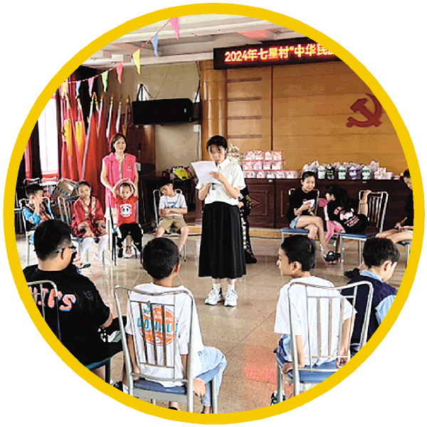 七星村委的会议室内,小朋友在分享革命先辈的英勇事迹。记者周子琪 摄
