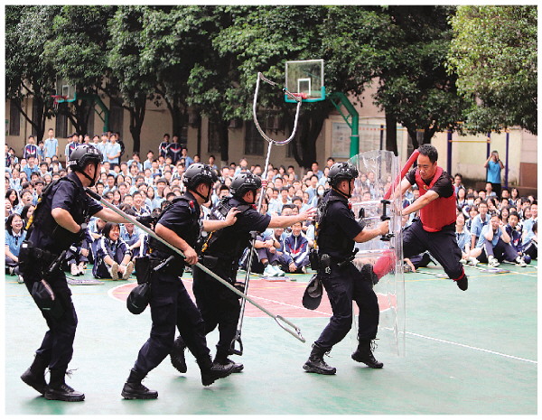 6月3日,桂林市奎光学校联合桂林市公安局秀峰分局巡特警大队、百梓派出所、秀峰街道办事处社区戒毒康复工作站等单位开展共建平安校园活动。图为特警们在向学生们展示处置突发事件的方法,惊险紧张的演练赢得了学生们的阵阵掌声。记者马翔 文/摄