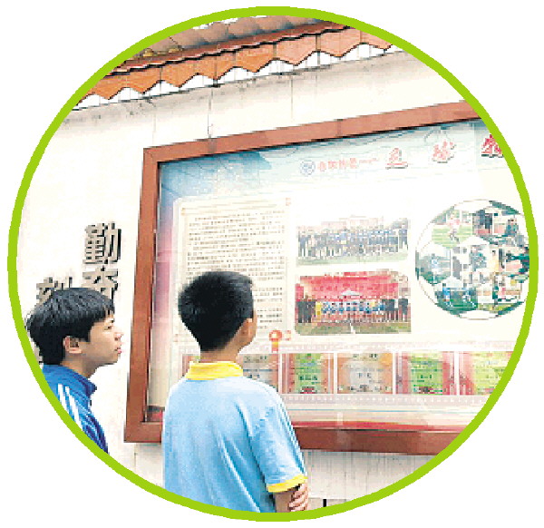 学生们在观看逸仙中学校园宣传栏普及的足球知识。
