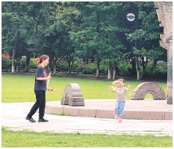 6日下午,一位家长带着小朋友在七星景区玩耍,这时一个大泡泡飞过来挡住了小朋友的脸,她却非常兴奋地说:“太好玩啦!今天好开心。” 记者滕嘉 摄
