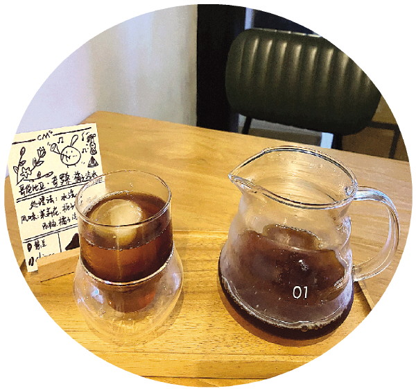 在这家店里,顾客交流最多的还是咖啡。咖啡可能会因品尝人的喜好不同,对于口感的评价也会不同。主理人按照流程,会将磨完的咖啡粉给顾客闻一下干香,之后开始萃取,大概3分钟后,加上冰块就可以完成。这家店最能打动人的,是在每一杯手冲咖啡上桌的时候,主理人都会贴心地放上一张手绘卡片。手绘卡片上写着咖啡豆的产地、处理方式、呈现风味,像一张说明书,让顾客能更好地了解这杯咖啡。