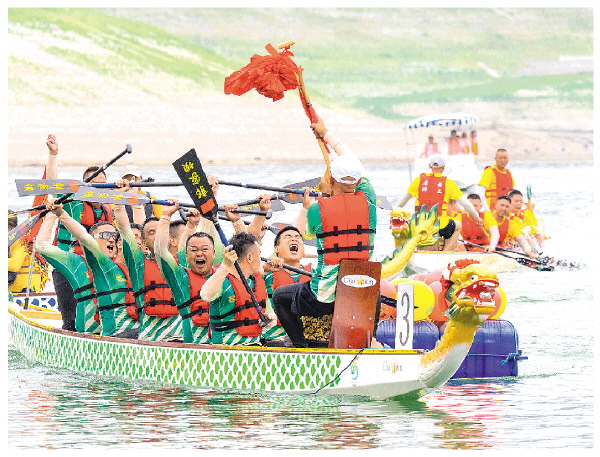 6月10日,湖北省宜昌市秭归县在三峡大坝前举办2024屈原故里传统龙舟赛。这是秭归县郭家坝镇代表队“抢红夺标”后欢庆胜利。 新华社发