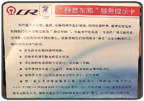 在每一个座椅背后都放置了“静音车厢”服务提示卡,上面对“静音车厢”进行了介绍,以及“静音车厢”需要遵守的规定和注意事项。