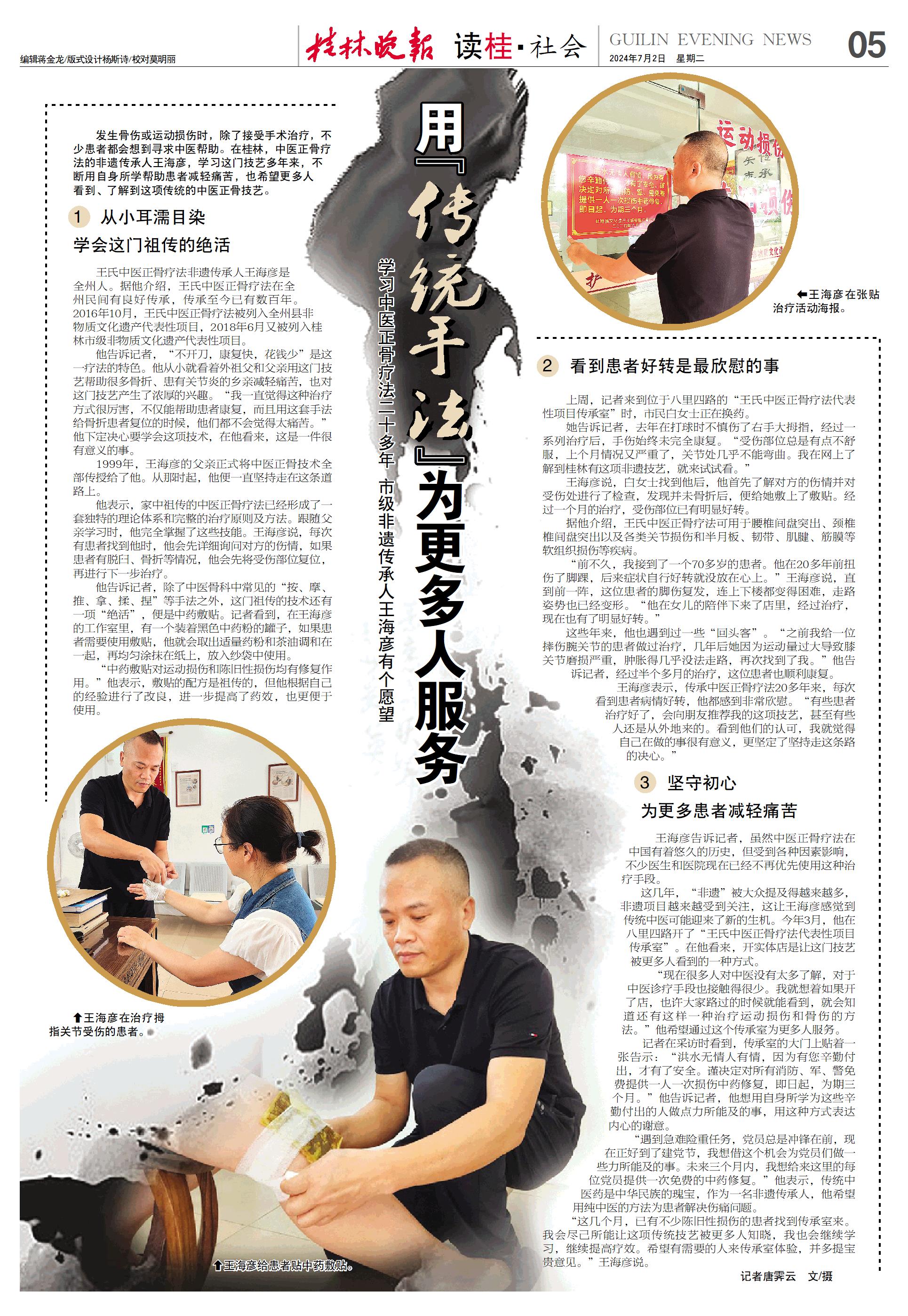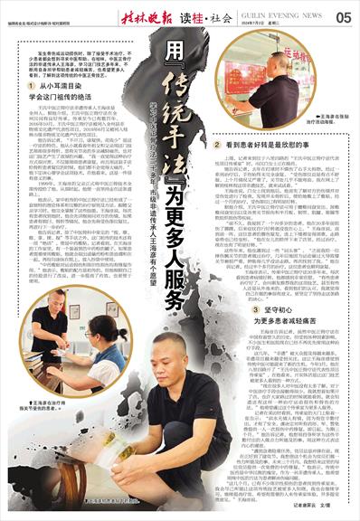 发生骨伤或运动损伤时,除了接受手术治疗,不少患者都会想到寻求中医帮助。在桂林,中医正骨疗法的非遗传承人王海彦,学习这门技艺多年来,不断用自身所学帮助患者减轻痛苦,也希望更多人看到、了解到这项传统的中医正骨技艺。