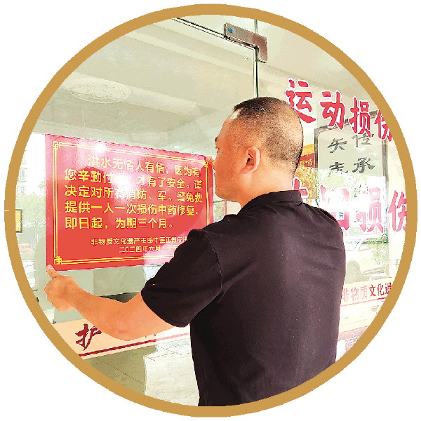 记者在采访时看到,传承室的大门上贴着一张告示:“洪水无情人有情,因为有您辛勤付出,才有了安全。谨决定对所有消防、军、警免费提供一人一次损伤中药修复,即日起,为期三个月。”他告诉记者,他想用自身所学为这些辛勤付出的人做点力所能及的事,用这种方式表达内心的谢意。