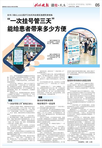 记者注意到,目前市人民医院、市中医医院、市中西医结合医院、市口腔医院及桂林医学院第二附属医院等多家医疗机构均宣布推出“一次挂号管三天”这一举措。