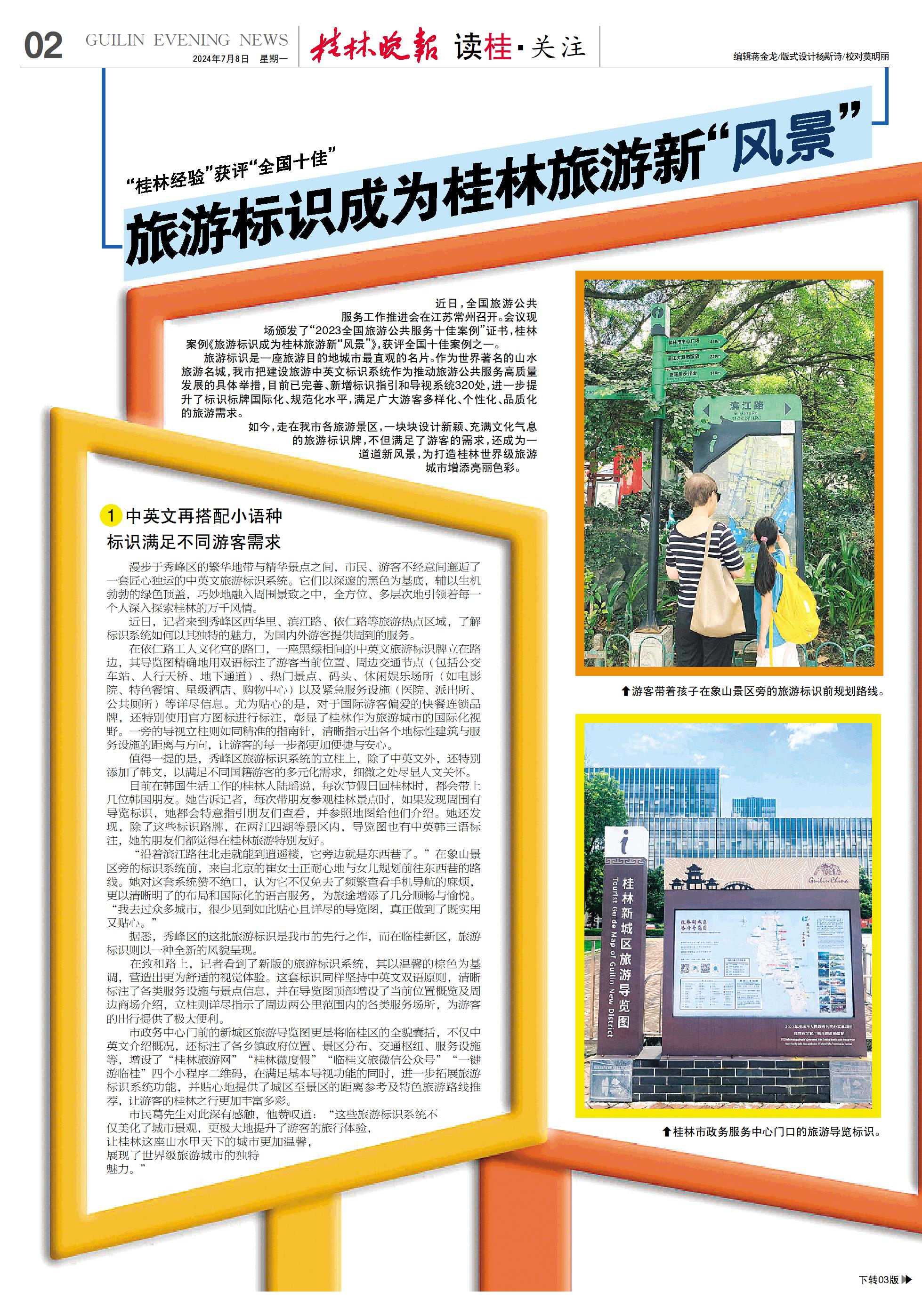 近日,全国旅游公共服务工作推进会在江苏常州召开。会议现场颁发了“2023全国旅游公共服务十佳案例”证书,桂林案例《旅游标识成为桂林旅游新“风景”》,获评全国十佳案例之一。