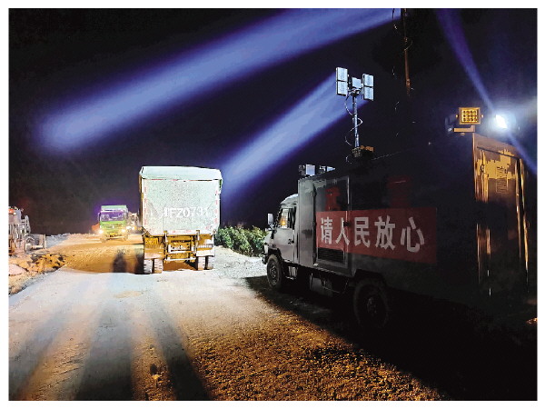 ↑7月7日凌晨,在湖南省岳阳市华容县团洲垸洞庭湖一线堤防决口处,武警部队官兵出动照明车为施工现场提供照明。 新华社记者李秉宣 摄