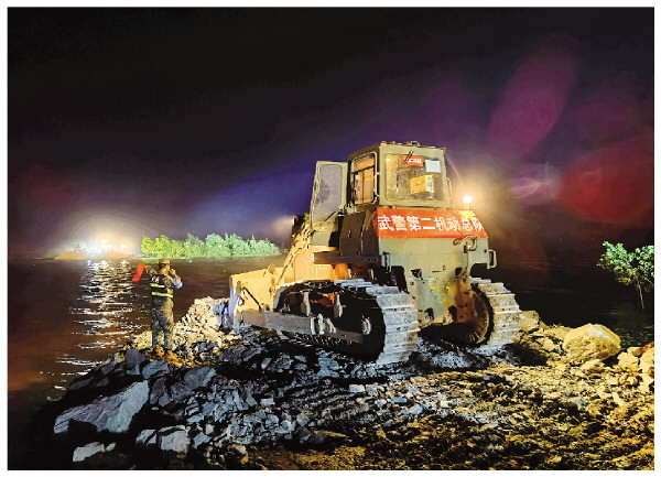 ←7月7日凌晨,在湖南省岳阳市华容县团洲垸洞庭湖一线堤防决口处,武警部队官兵操纵工程机械封堵决口。 新华社记者李秉宣 摄