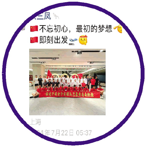 本周一,中国女子水球队出征巴黎,农三凤发了一条朋友圈,表示自己会全力备战,争取为祖国赢得荣誉。(农三凤朋友圈截图)