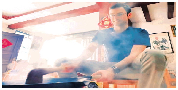 杰克正在打油茶体验桂林本地的美食。(视频截图)