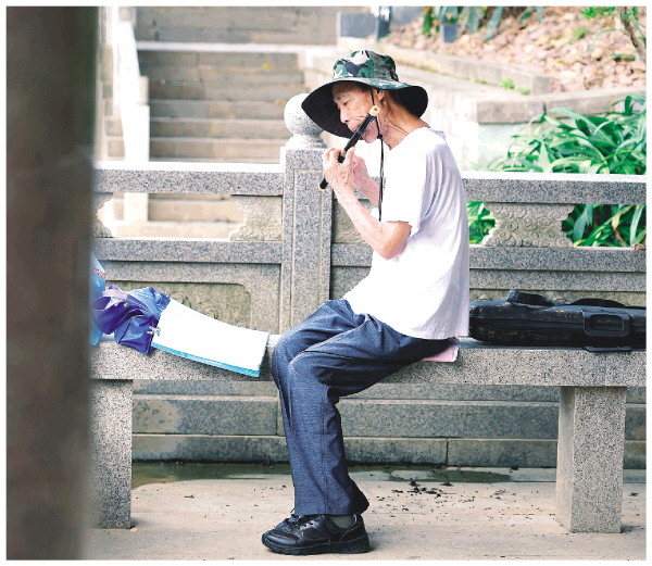 8月1日下午,一位市民在西门桥畔一边看着曲谱,一边吹着笛子,笛声婉转悠扬、富有意境,引得不少市民围观。 记者邢刚 摄