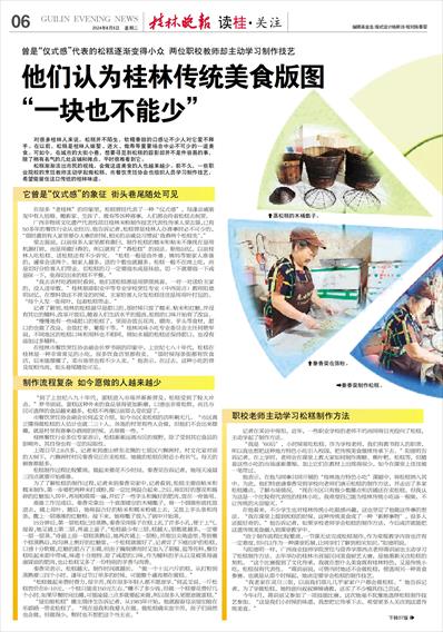 他表示,在他与同事共同开展的“桂林地方特色小吃”课题中,将松糕纳入其中。为此,他们特意请秦香荣到学校向老师们演示松糕的制作方法,并走访了多家松糕摊点,了解市场情况。“现在市区只有极少数摊点和店铺还在卖松糕,但我认为这是一个比较有代表性的桂林小吃。我希望自己能为桂林传统小吃添一根柴,不让传统的火苗熄灭。”