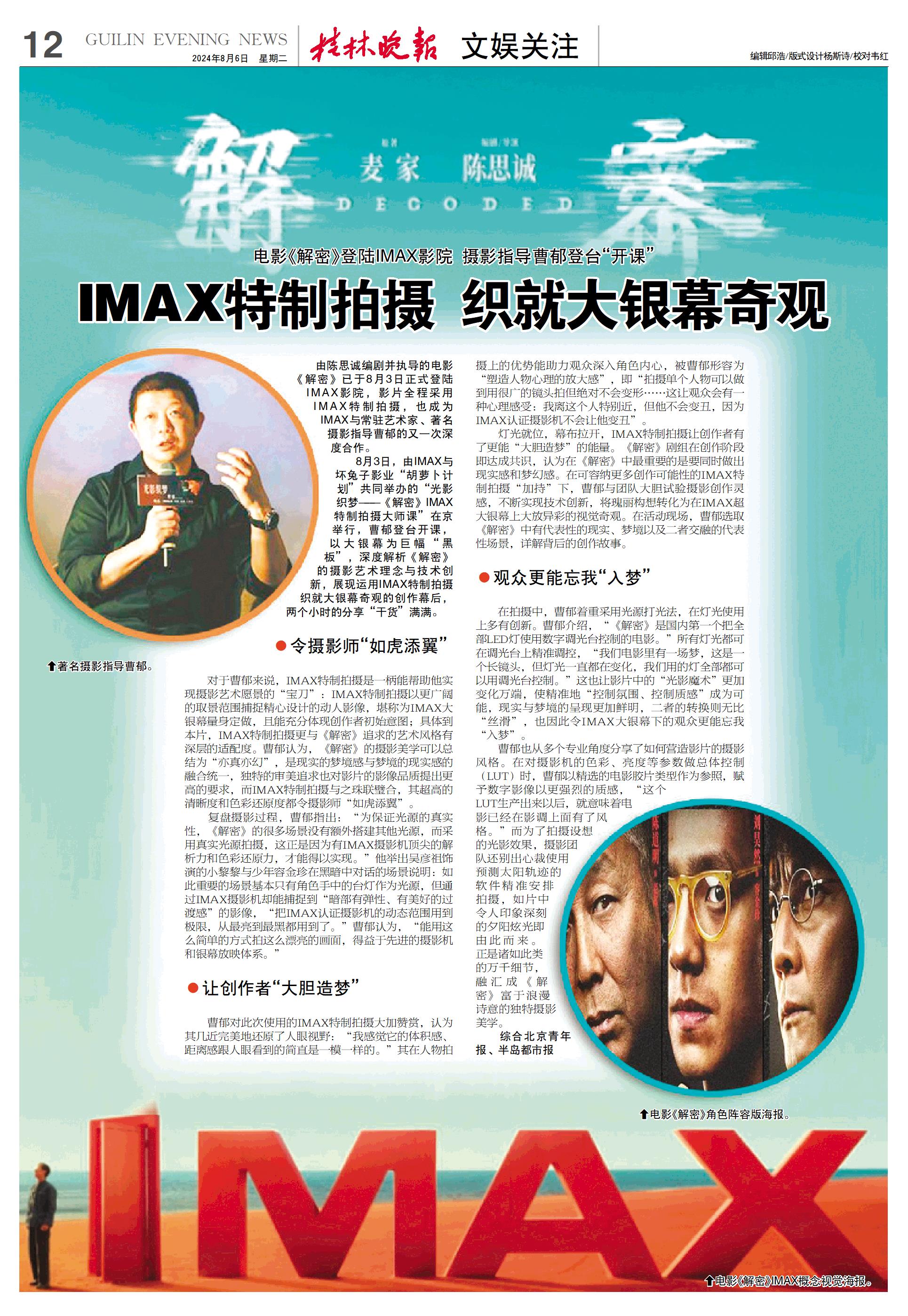 由陈思诚编剧并执导的电影《解密》已于8月3日正式登陆IMAX影院,影片全程采用IMAX特制拍摄,也成为IMAX与常驻艺术家、著名摄影指导曹郁的又一次深度合作。