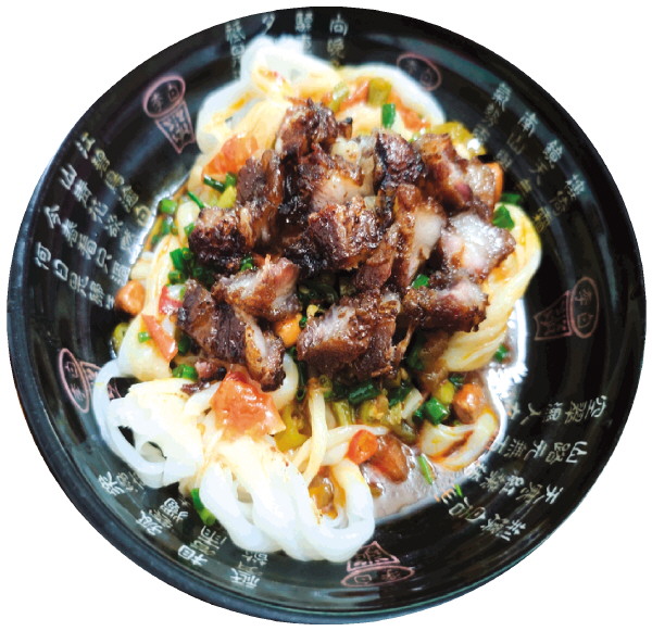 记者也点了一碗凉拌粉。只见爽滑的米粉浸泡在红色的酱汁里,上面铺了一层叉烧肉,用筷子搅拌均匀,洁白的米粉瞬间染上了红色。与视觉上强烈的红色不同,送入口中的米粉却并没有绽放出浓烈的辣味,只是在一股清爽的酸、甜中微微透出一丝辣意。跟米粉搭配的叉烧肉也格外入味,不仅有了一层焦糖味的外壳,也毫不油腻。吃一口清爽酸辣的米粉,再来一块叉烧,不一会儿,一碗凉拌粉就被吃完了。