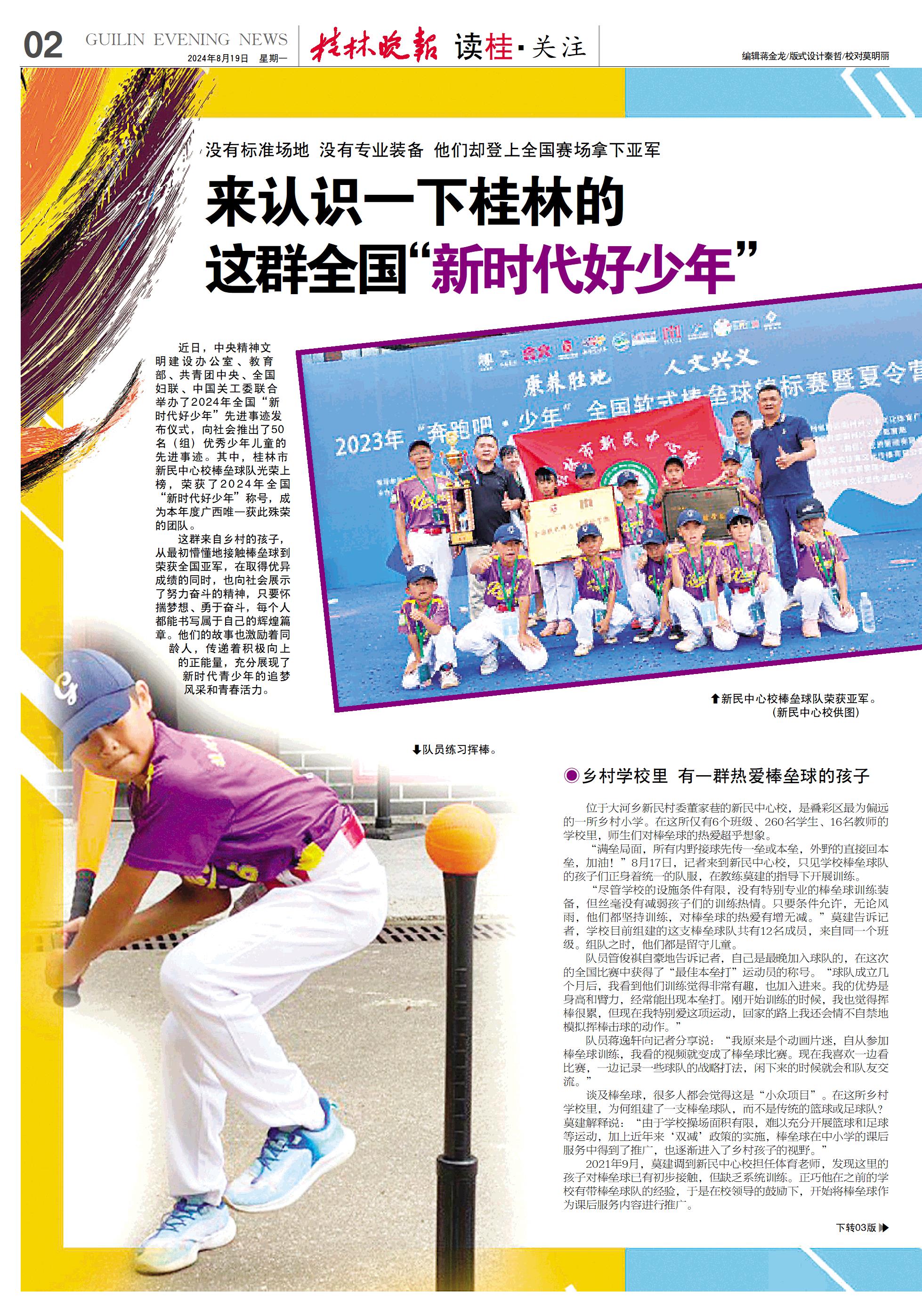 近日,中央精神文明建设办公室、教育部、共青团中央、全国妇联、中国关工委联合举办了2024年全国“新时代好少年”先进事迹发布仪式,向社会推出了50名(组)优秀少年儿童的先进事迹。其中,桂林市新民中心校棒垒球队光荣上榜,荣获了2024年全国“新时代好少年”称号,成为本年度广西唯一获此殊荣的团队。