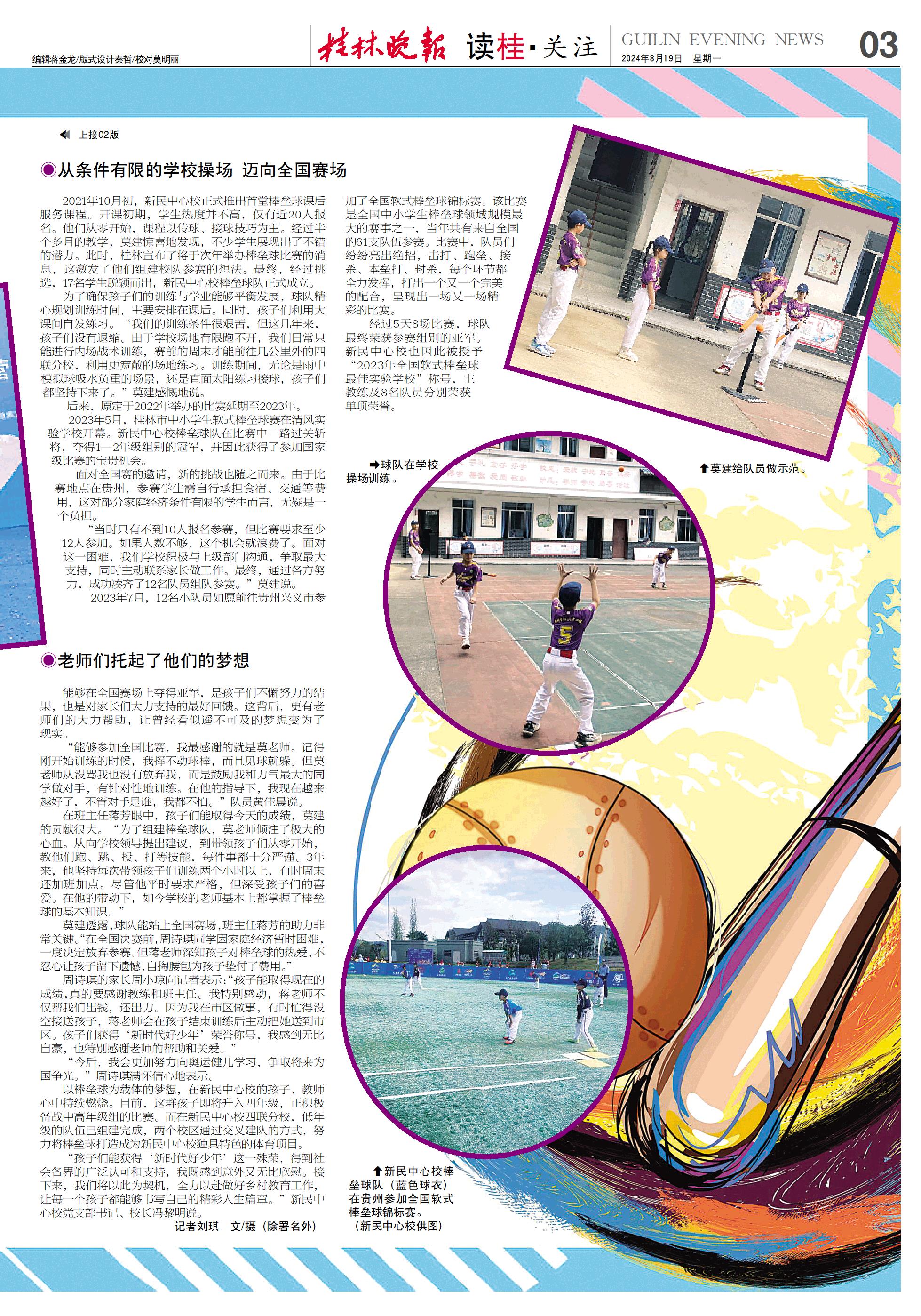 2023年5月,桂林市中小学生软式棒垒球赛在清风实验学校开幕。新民中心校棒垒球队在比赛中一路过关斩将,夺得1—2年级组别的冠军,并因此获得了参加国家级比赛的宝贵机会。