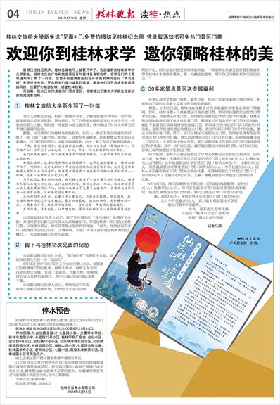 市文旅局相关负责人表示,除了信中提到的“我与桂林”免费打卡合影,来桂林求学的新生还可凭本人录取通知书,享受桂林多个热门景区免费门票,以及部分景区、游乐园等景点低价折扣优惠。“此外,桂林还有众多可以免费打卡的好山好水、文博场馆,欢迎广大学子前去感受桂林独特的魅力。”市文旅局相关负责人说道。