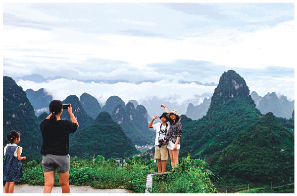 最近天气变化较大,雨后的桂林云雾缭绕,美极了。图为游客在阳朔与雨后美景合影。记者滕嘉 摄