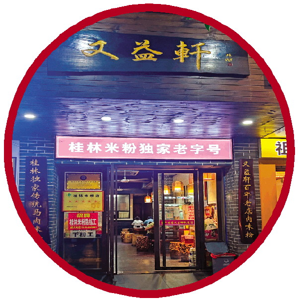 又益轩店铺装潢是古色古香的中式风格,门头招牌上写有“桂林米粉独家老字号”的字样,店门两边还挂着“桂林独家传统马肉米粉”、“又益轩百年老店卤味粉”的牌子,店里墙上的黑白照片,展示着旧时的城市风光以及菜单上的桂林米粉,这些都在向食客诉说着这家店已经走过悠长的岁月。