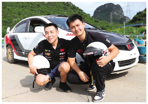 ↑毛翰知(右)与领航员金元在拉力赛车前合影。