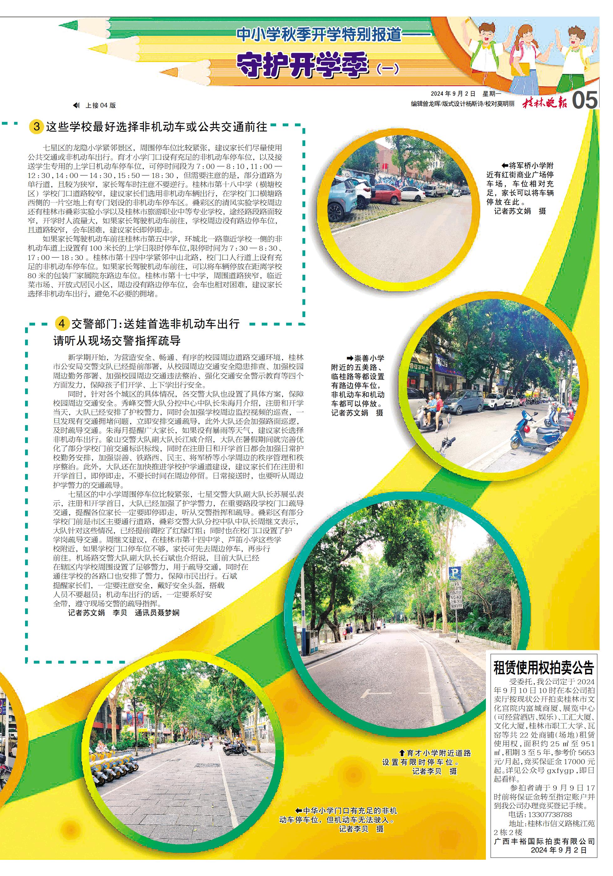 七星区的中小学周围停车位比较紧张,七星交警大队副大队长苏展弘表示,注册和开学首日,大队已经加强了护学警力,在重要路段学校门口疏导交通,提醒各位家长一定要即停即走,听从交警指挥和疏导。叠彩区有部分学校门前是市区主要通行道路,叠彩交警大队分控中队中队长周继文表示,大队针对这些情况,已经提前调控了红绿灯组;同时也在校门口设置了护学岗疏导交通。周继文建议,在桂林市第十四中学、芦笛小学这些学校附近,如果学校门口停车位不够,家长可先去周边停车,再步行前往。机场路交警大队副大队长石斌也介绍说,目前大队已经在辖区内学校周围设置了足够警力,用于疏导交通,同时在通往学校的各路口也安排了警力,保障市民出行。石斌提醒家长们,一定要注意安全,戴好安全头盔,搭载人员不要超员;机动车出行的话,一定要系好安全带,遵守现场交警的疏导指挥。