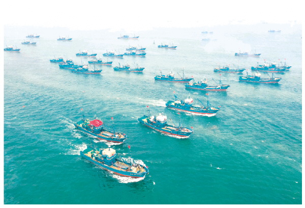 9月1日,在山东省荣成市石岛渔港,渔船出海驶向秋季捕捞作业海域(无人机照片)。