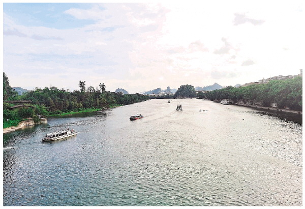 近日,漓江市区段内多艘游船搭乘游客游览,给人一种“船”流不息的感觉。 记者滕嘉 摄