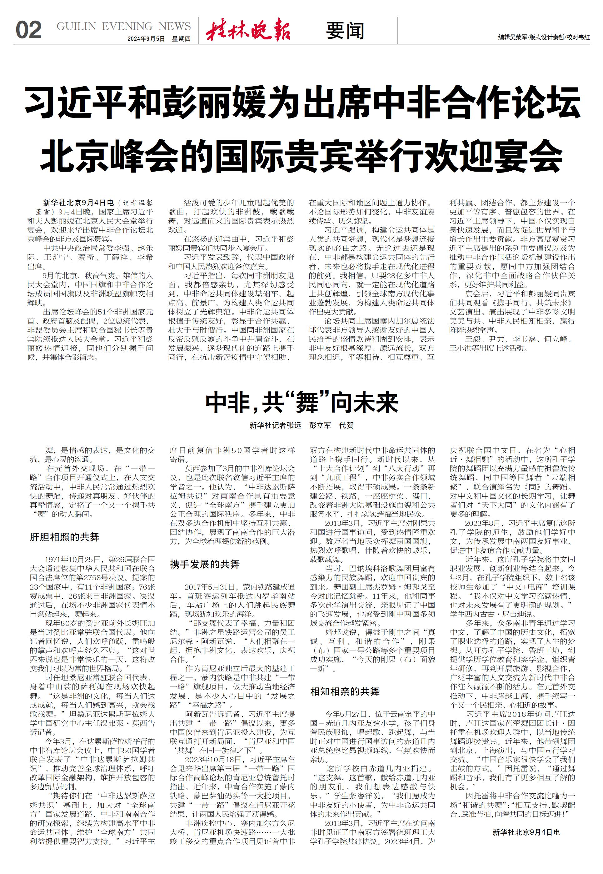 新华社北京9月4日电(记者温馨 董雪)9月4日晚,国家主席习近平和夫人彭丽媛在北京人民大会堂举行宴会,欢迎来华出席中非合作论坛北京峰会的非方及国际贵宾。