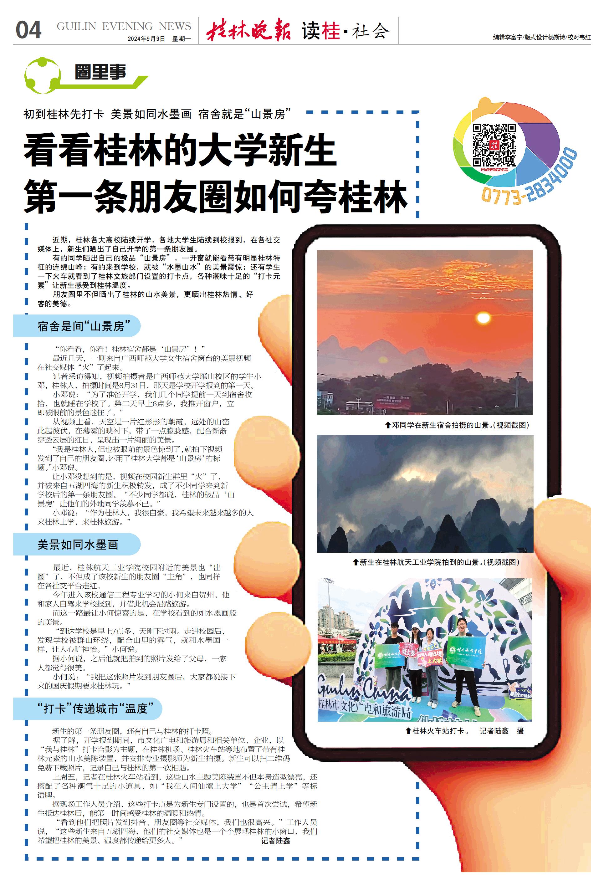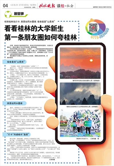 “看到他们把照片发到抖音、朋友圈等社交媒体,我们也很高兴。”工作人员说,“这些新生来自五湖四海,他们的社交媒体也是一个个展现桂林的小窗口,我们希望把桂林的美景、温度都传递给更多人。” 记者陆鑫