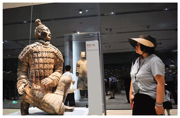8日,在秦始皇帝陵博物院,观众在观看展出的兵马俑。新华社发