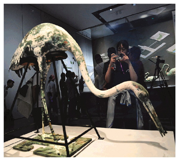 8日,在秦始皇帝陵博物院,观众在拍摄展出的青铜鹤。新华社发