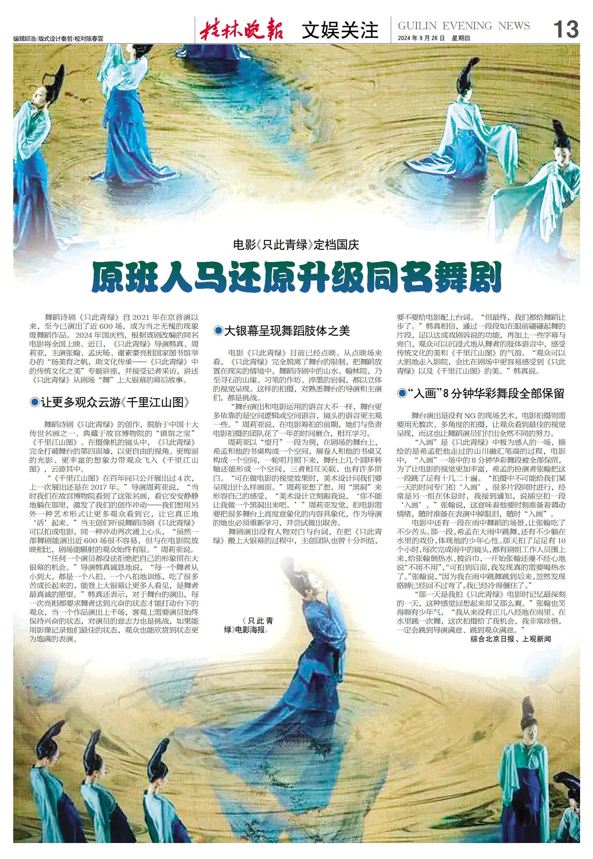 舞剧演出没有人物对白与台词,在把《只此青绿》搬上大银幕的过程中,主创团队也曾十分纠结,要不要给电影配上台词。“但最终,我们都给舞蹈让步了。”韩真相信,通过一段段如在眼前翩翩起舞的片段,足以达成戏剧诉说的功能,再加上一些字幕与旁白,观众可以沉浸式地从舞者的肢体语言中,感受传统文化的美和《千里江山图》的气韵。“观众可以大胆地走入影院,会比在剧场中更容易感受到《只此青绿》以及《千里江山图》的美。”韩真说。