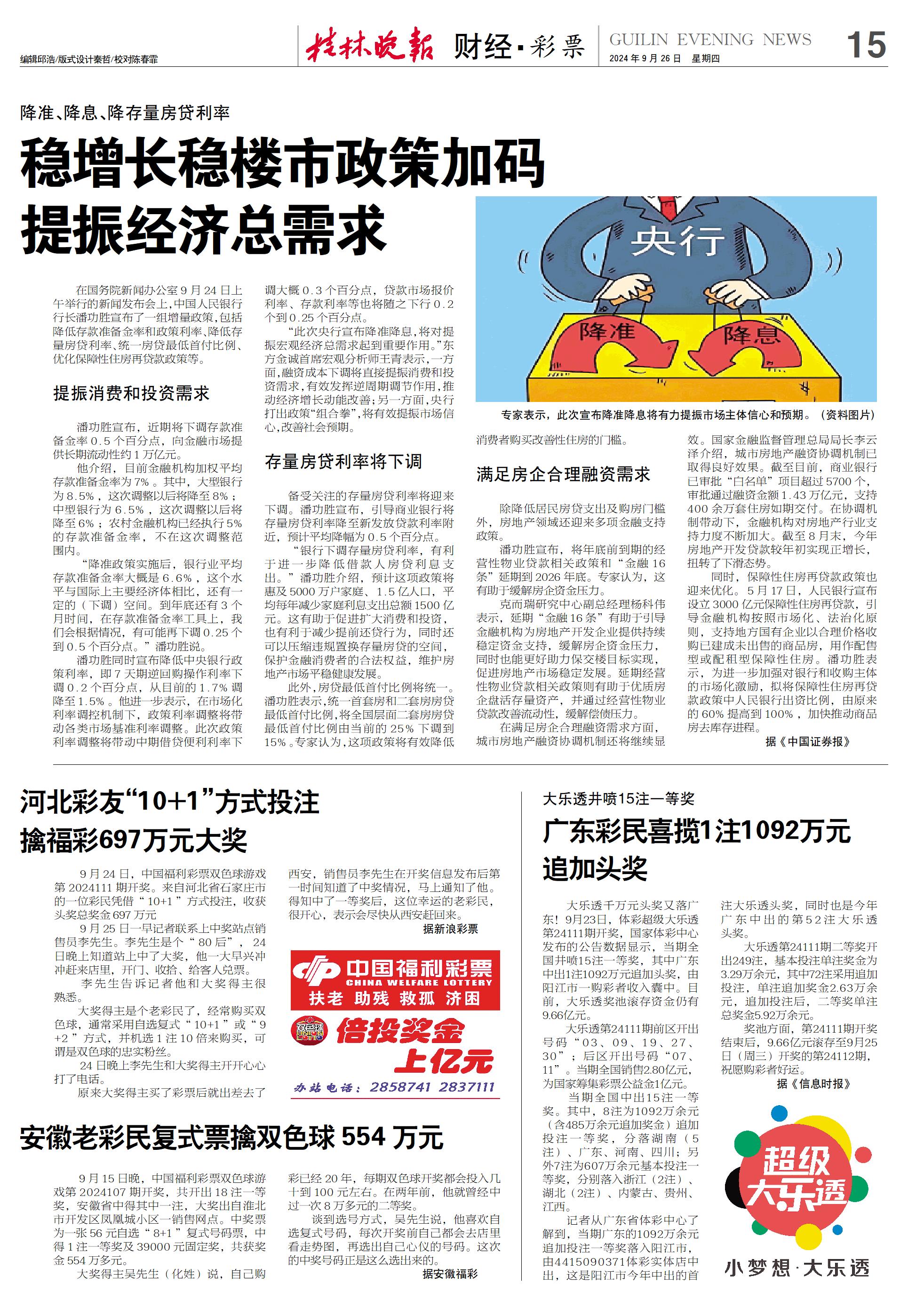提振消费和投资需求 潘功胜宣布,近期将下调存款准备金率0.5个百分点,向金融市场提供长期流动性约1万亿元。 他介绍,目前金融机构加权平均存款准备金率为7%。其中,大型银行为8.5%,这次调整以后将降至8%;中型银行为6.5%,这次调整以后将降至6%;农村金融机构已经执行5%的存款准备金率,不在这次调整范围内。 “降准政策实施后,银行业平均存款准备金率大概是6.6%,这个水平与国际上主要经济体相比,还有一定的(下调)空间。到年底还有3个月时间,在存款准备金率工具上,我们会根据情况,有可能再下调0.25个到0.5个百分点。”潘功胜说。 潘功胜同时宣布降低中央银行政策利率,即7天期逆回购操作利率下调0.2个百分点,从目前的1.7%调降至1.5%。他进一步表示,在市场化利率调控机制下,政策利率调整将带动各类市场基准利率调整。此次政策利率调整将带动中期借贷便利利率下调大概0.3个百分点,贷款市场报价利率、存款利率等也将随之下行0.2个到0.25个百分点。 “此次央行宣布降准降息,将对提振宏观经济总需求起到重要作用。”东方金诚首席宏观分析师王青表示,一方面,融资成本下调将直接提振消费和投资需求,有效发挥逆周期调节作用,推动经济增长动能改善;另一方面,央行打出政策“组合拳”,将有效提振市场信心,改善社会预期。